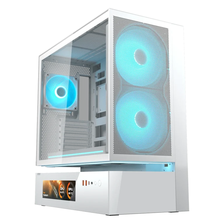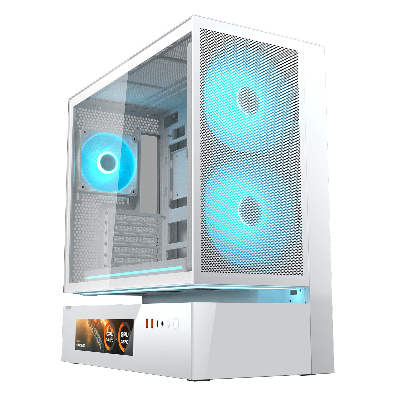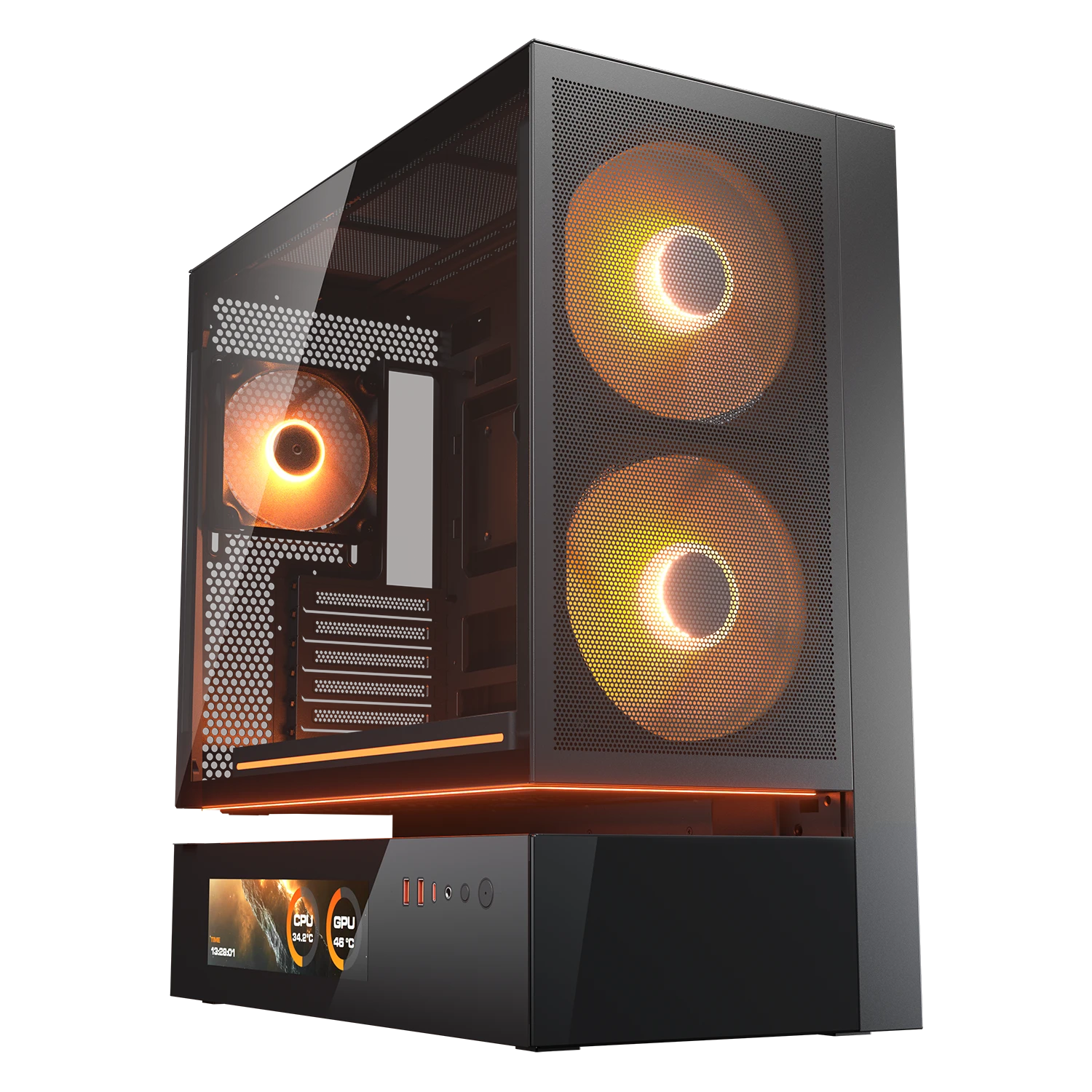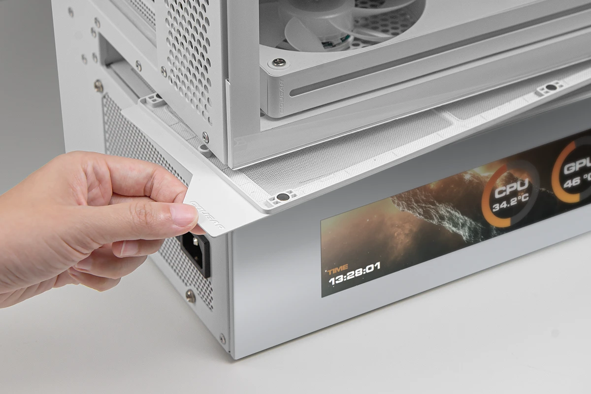 CFV235 Mesh Vision 采用创新的中空悬浮气流架构(Central Floating Ventilation, CFV),将电源舱与主舱室分离,并利用两者之间的开放空间作为额外的散热通道,不仅保留精巧机身尺寸,更在空间设计实现高效通风性能。机身整合 9.16 吋 IPS TFT LCD 面板,可透过软体即时监控系统状态,1920×462 高解析、60Hz 更新率,清晰呈现关键数据与自订影像。 搭配 3 合 1 前面板模组(网孔面板 + 双 160mm ARGB PWM 风扇 + 防尘滤网),CFV235 Mesh Vision 结合极致散热与沉浸视觉,带来前所未有的气流体验。