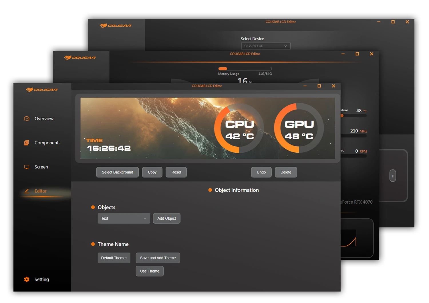CFV235 Mesh Vision 搭载 9.16 吋 IPS TFT LCD 萤幕,以超清晰的 1920 x 462 解析度与 60Hz 更新率,提供即时系统监控。从温度到风扇转速,所有关键数据尽收眼底;同时支援 JPG、PNG、GIF、MP4 档案自订显示,透过桌面软体即可像操作指挥中心般随心掌控。
